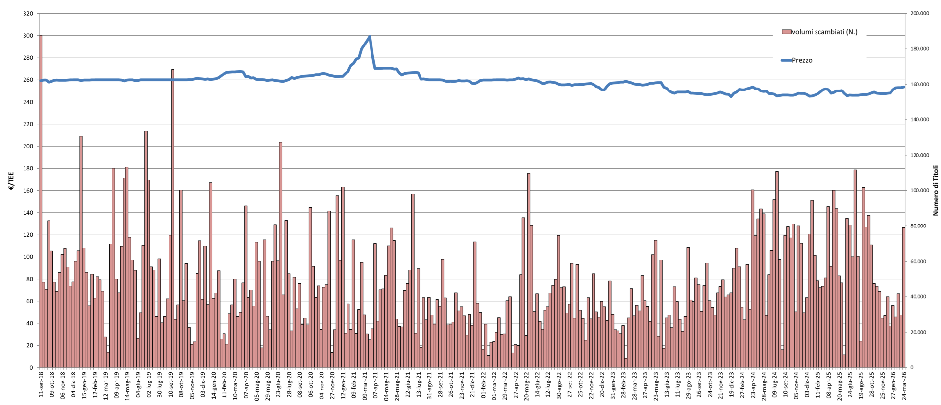 Si riporta di seguito la situazione aggiornata alla sessione del 24/03/2026 come riscontrabile dai dati del GME reperibili al sito Mercato TEE.